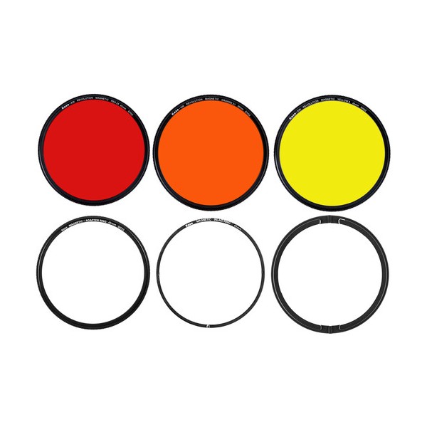 Le kit de filtres 3 en 1 Kase Wolverine Revolution B&W de 49 combine les filtres jaune n° 8, orange n° 21 et rouge n° 25 avec des adaptateurs magnétiques à visser et à incruster, un outil d'installation et de retrait et un étui à filtre à sept poches.