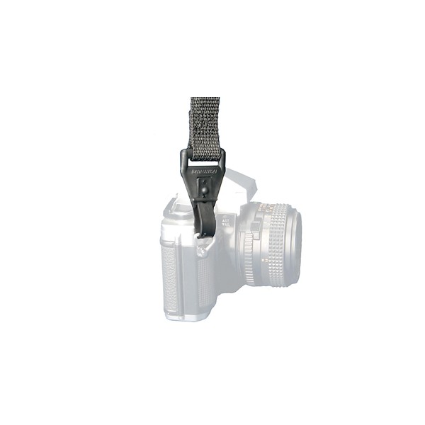 Système breveté offrant une connexion résistante et souple, compatible avec la plupart des points de fixation photo. Les raccords rapides se clipent pour former une poignée de transport compacte.