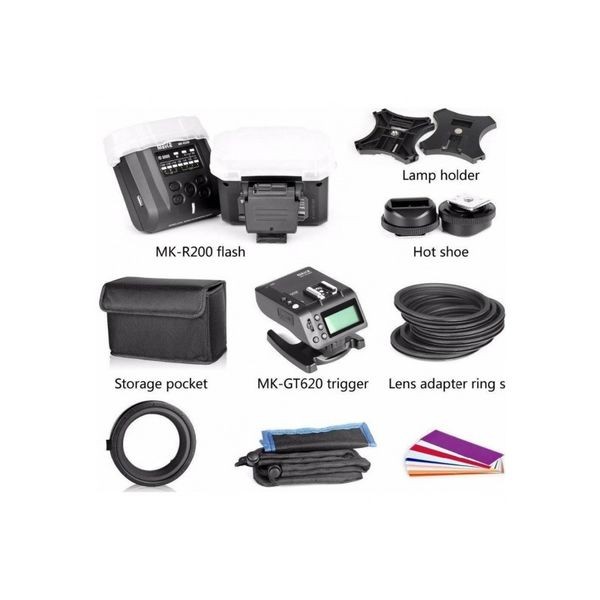 L'ensemble se compose de deux flashs macro MK-R200 et d'un émetteur-récepteur MK-GT620 de 2,4 GHz qui peut contrôler de manière flexible la luminosité dans un environnement de photographie à micro-distance, en transmettant des signaux sans fil.