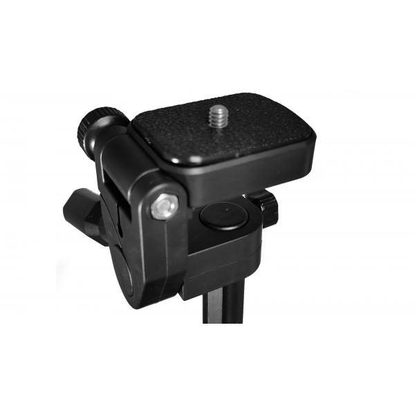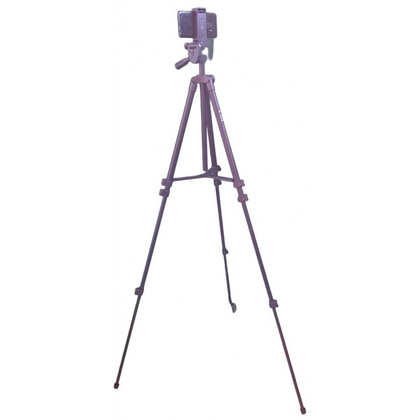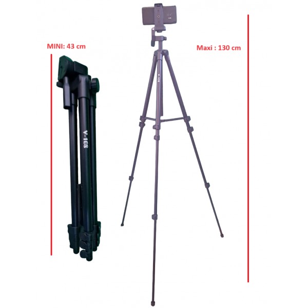 Trépied alliage d'aluminium livré avec son étui et son support universel pour smartphone.